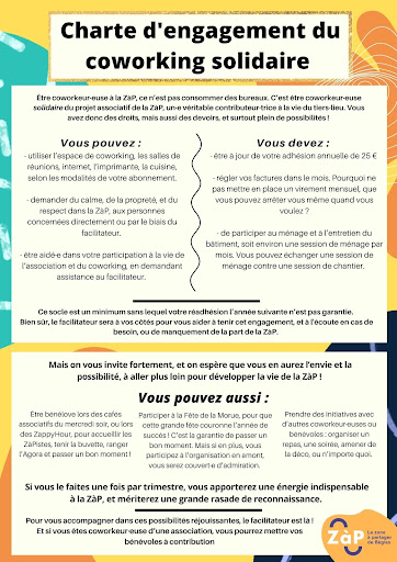 - Le tarif accessible permet à des entrepreneurs ou associations aux budgets modestes de disposer d’un lieu de travail financièrement abordable. En contrepartie, les coworkers s’engagent à participer selon leurs disponibilités à la vie de la ZàP. Cela va du ménage à l’animation d’une formation sur leur cœur de métier, en passant par la réalisation de plans pour l’aménagement de la ZàP ou l’accueil de visiteurs. Ils sont également encouragés à participer aux projets des associations membres de la ZàP.